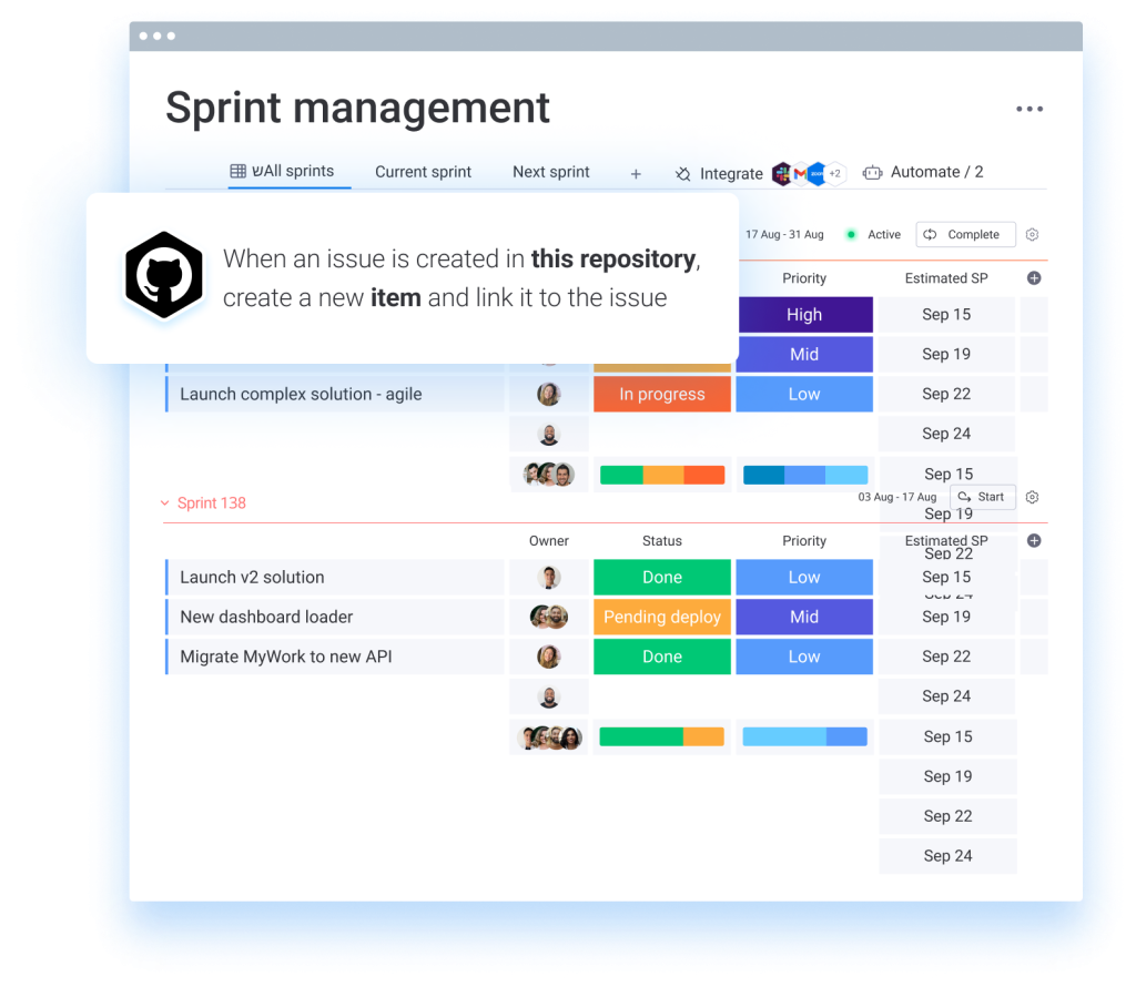 Custom automations reduce operational work that increases your development project’s time to market, and task dependencies show how various tasks are related, ensuring that if a single task is adjusted, the change can affect all dependent tasks in a sprint.