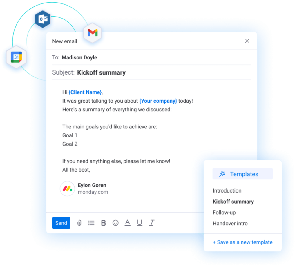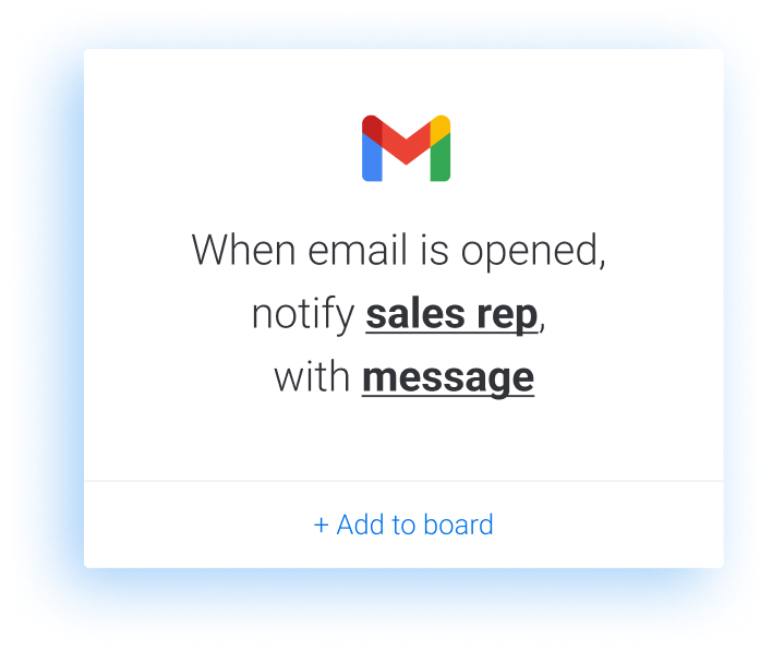monday CRM seamlessly integrates with the tools and apps that your sales teams already use every day. For example, monday.com CRM email integrations can automatically sync the messages in your regular inbox with your project workflows, creating action items from incoming emails, and ensuring that everything is accessible from one convenient location.