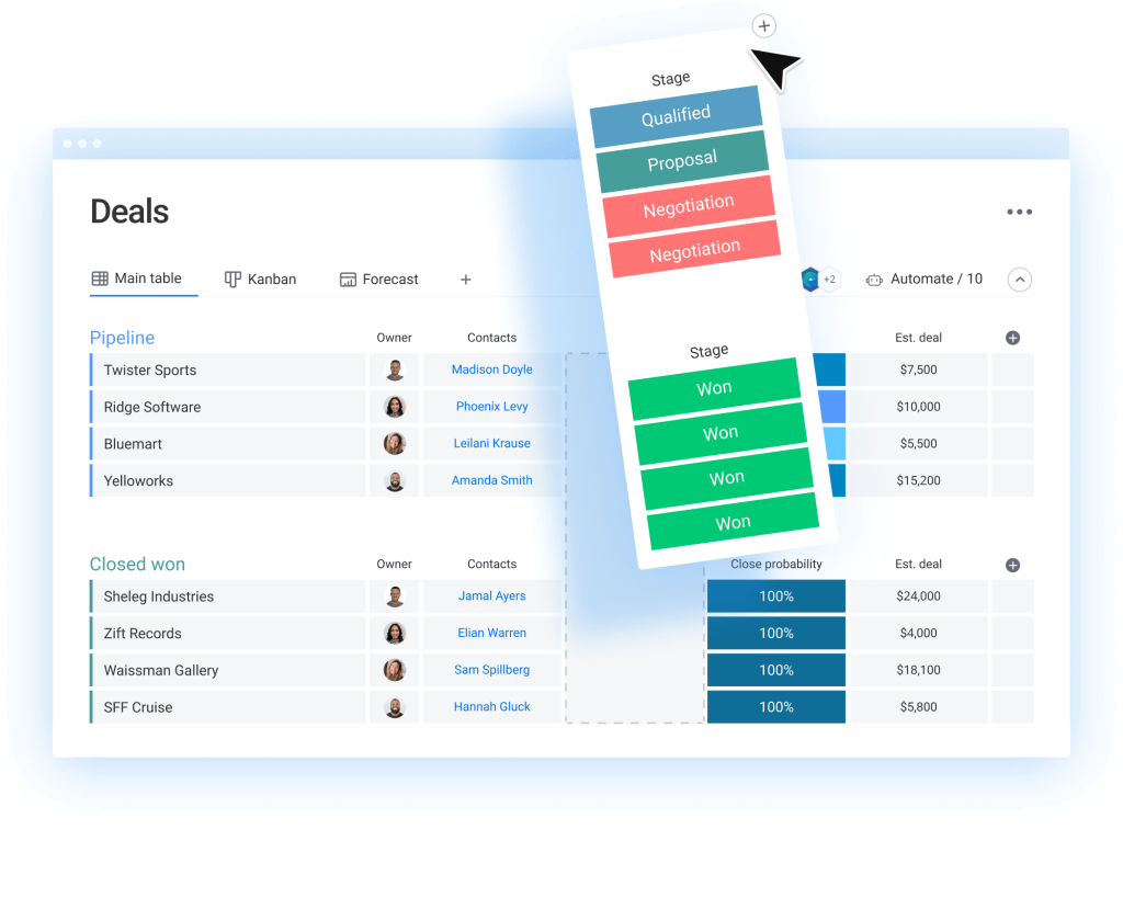 monday CRM lets you manage every aspect of your sales cycle in one centralised place. Use monday CRM to control your entire sales funnel and close more deals, faster by automating manual work and streamlining activities.